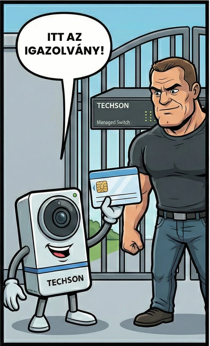 Képzeljük el a szituációt: egy idegen (nevezzük "Gonosz Hackernek") talál egy szabad Ethernet kábelt az épület oldalán, ami egy kültéri kamerához vezet. Lecsavarozza a kamerát, bedugja a laptopját, és... BINGO! Mivel a switch portja nyitva volt, máris hozzáfér a belső hálózathoz.