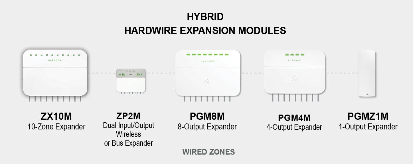 Nem csak a nyitásérzékelők között van olyan termék, ami rendelkezik vezetékes csatlakozóval, hanem maga a ZX10M zónabővítő modul is. A ZX10M modul feladata a különféle vezetékes eszközök illesztése a rendszerhez, zónaként. A modul tápellátással is szolgál, így nem csak egyszerű nyitásérzékelők, hanem tápellátást igénylő érzékelők fogadására is alkalmas. Az 1. zónabemenete programozható tűzzónaként, fogadhat 2 vagy 4 vezetékes füstérzékelőt.