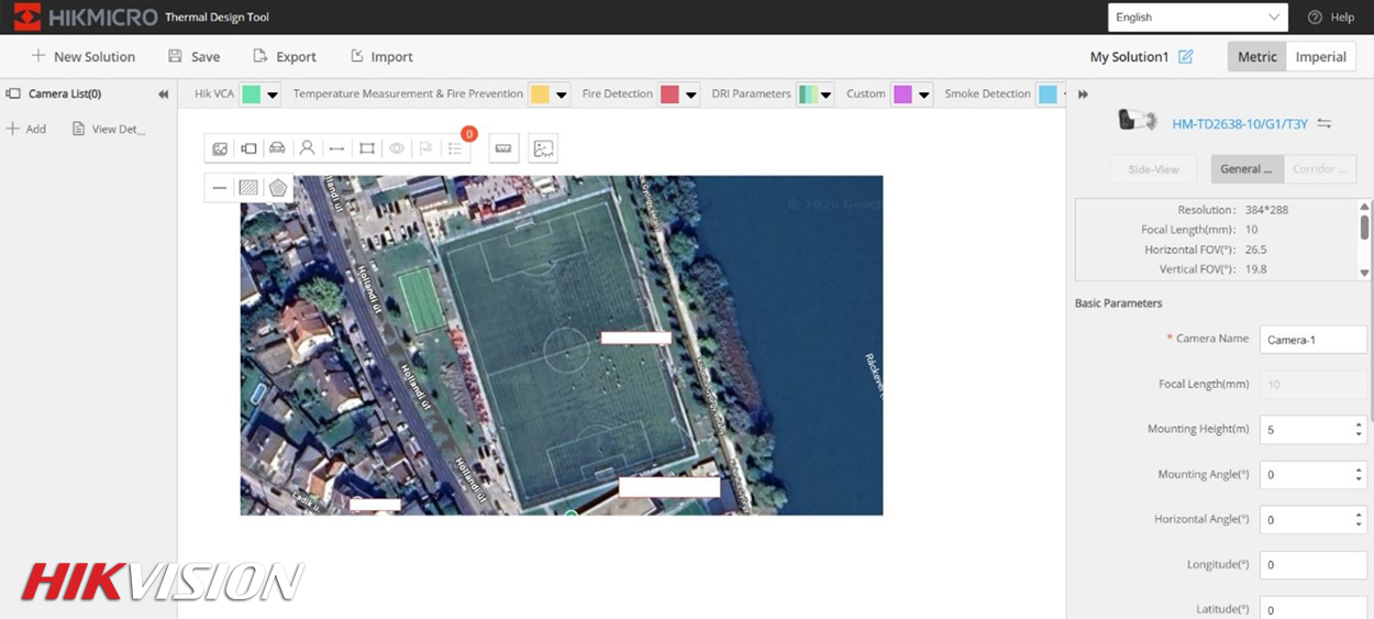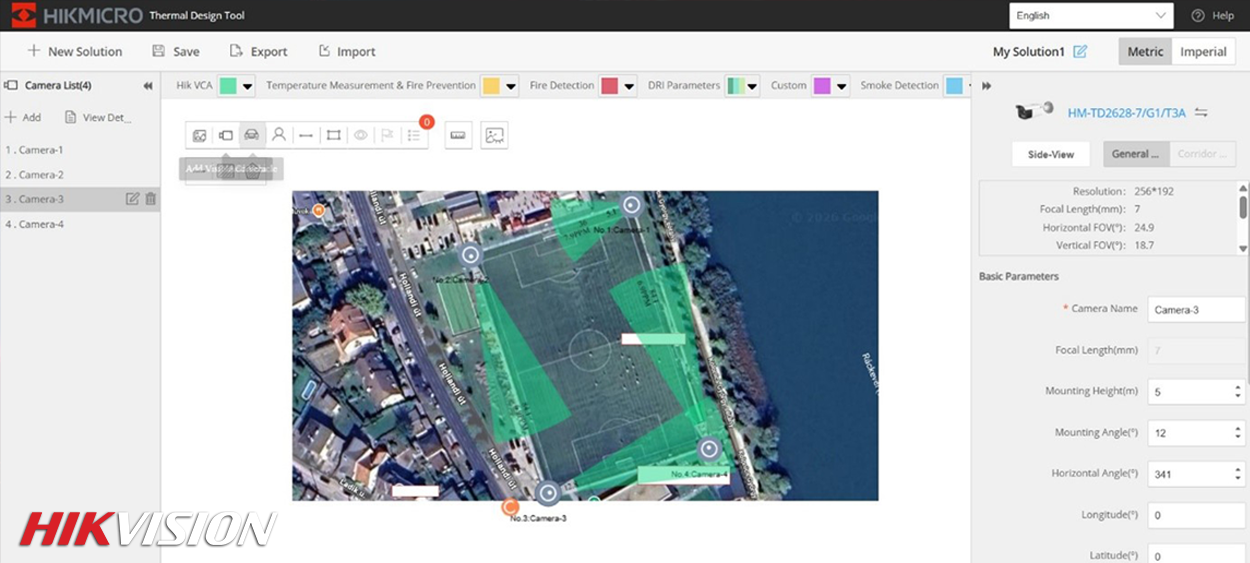 A HikMicro Tool kiválóan alkalmazható hőkamerás területvédelem tervezésére, legyen szó ipari telephelyről, raktárról, logisztikai központról vagy kültéri védett területről. A szoftver segítségével pontosan megtervezhető, hogy az adott kamerák milyen területet fednek le, hol helyezkednek el az észlelési zónák, és hol lehet szükség további kamerák telepítésére.